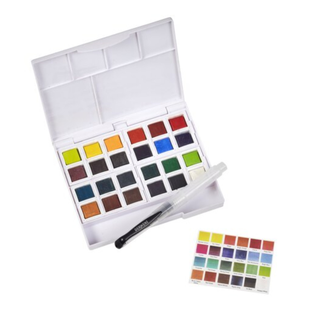 A készlet 24 színe: Sherbet Lemon, Sun Yellow, Mango, Bright Orange, Cherry, Poppy Red, Fuchsia, Dark Plum, Violet, Navy Blue, Mid Ultramarine, Bright Blue, Turquoise, Teal Green, Racing Green, Ionian Green, Hookers Green, Kiwi, Burnt Yellow Ochre, Red Oxide, Natural Brown, Paynes Grey, Ink Black, Antique White