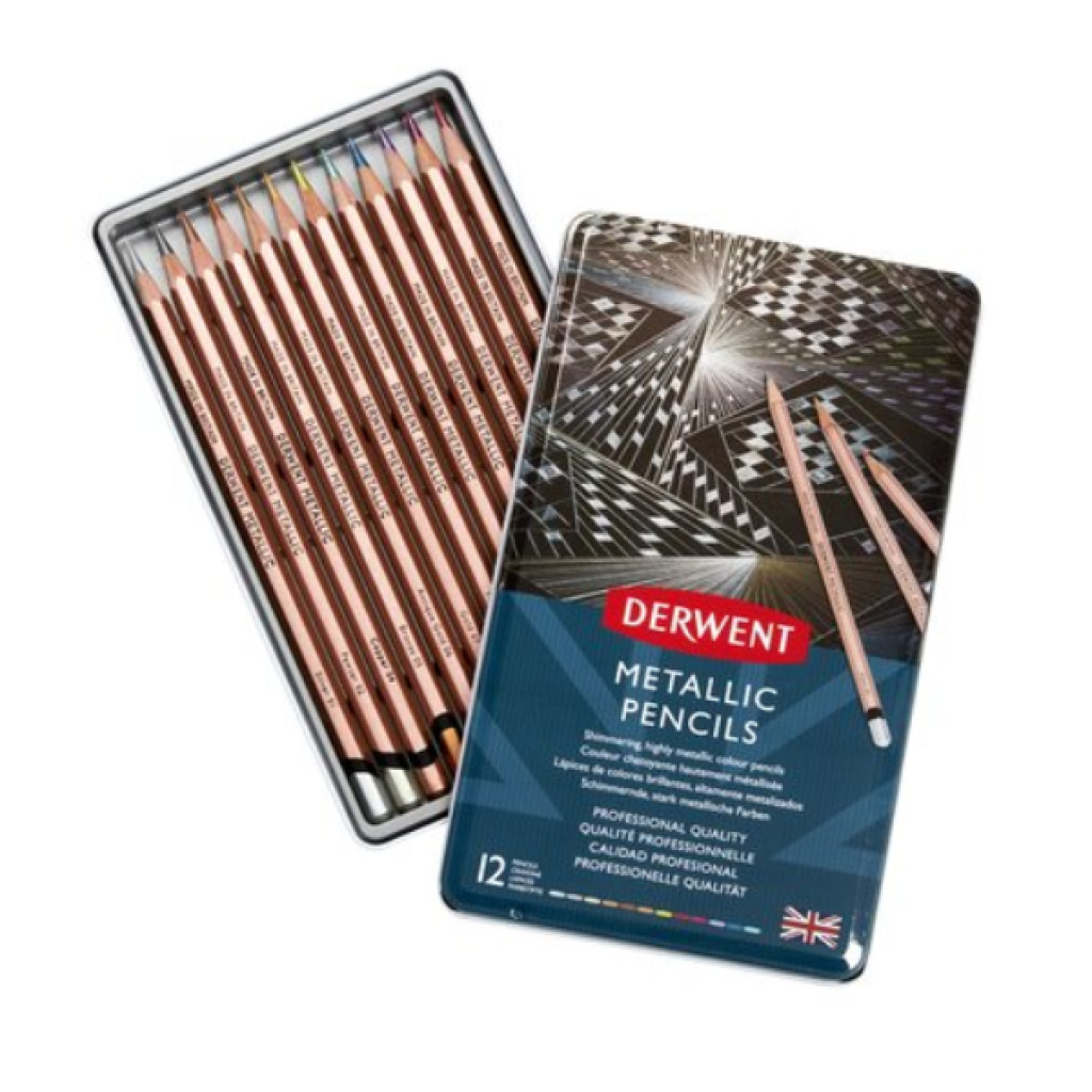 Derwent Metallic ceruza készlet 12 gyönyörű, fémesen csillogó színt tartalmaz. Az erős hegy ragyogó élességet és gazdag színfelvitelt eredményez, a csillogó pigmentek és az intenzív, fémes színek gyönyürűek fénylenek, akár sötét papíron is.