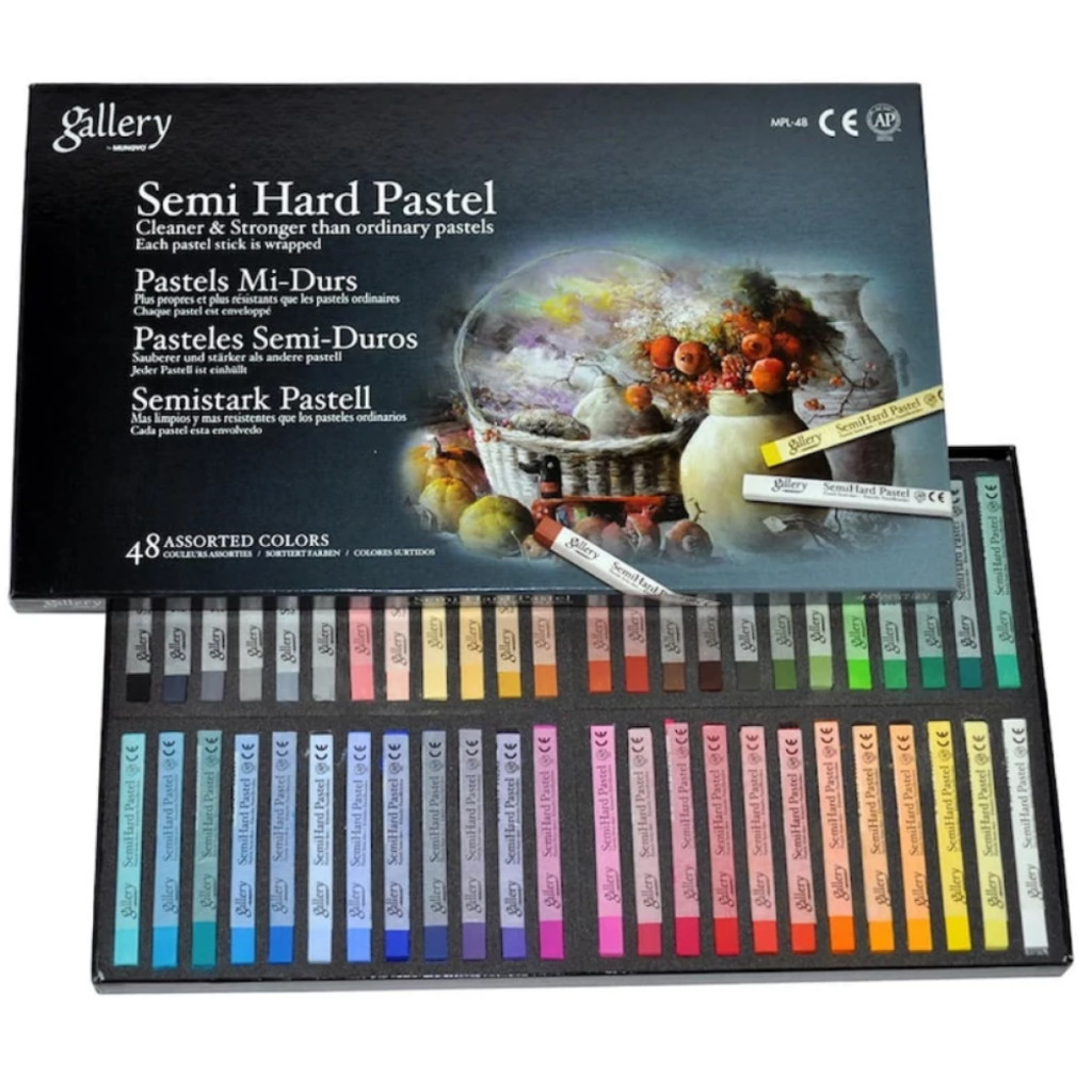 Professzionális félkemény pasztellkészlet a neves koreai Mungyo gyártótól. A készlet egy praktikus kartondobozban érkezik, amely 48 gyönyörű színt tartalmaz. A kréták ergonomikus kialakításúak: az élükkel vékony vonalakat, míg teljes felületükkel szélesebb satírozásokat hozhatsz létre. A pasztellek kimagasló minőségűek, klasszikusan matt színekkel, kiemelkedő fényállósággal és remek fedőképességgel. Tökéletesen tapadnak az érdes felületekhez, kiválóan árnyékolhatók, és finom, bársonyos hatást biztosítanak. A közepesen kemény rudak kevésbé hajlamosak a törésre, és minimális port termelnek, így egyszerű és kellemes a használatuk. Fakulásálló.