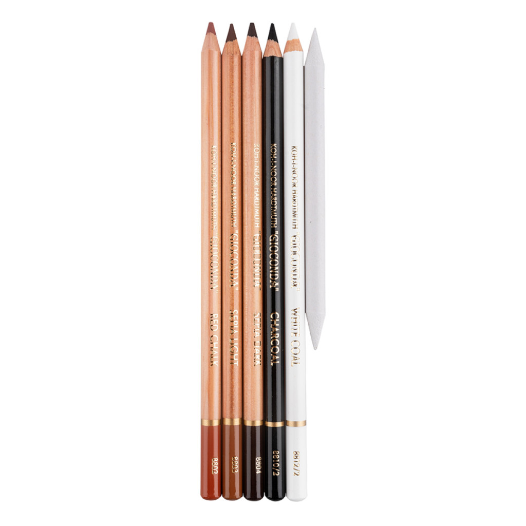 Öt darabos művész ceruzakészlet satírceruzával ideális rajzoláshoz, vázlatokhoz. Ez a készlet három speciális, szépia árnyalatú ceruzát tartalmaz. A vörösesbarna olajosabb jellegű, míg a világos és sötét szépia száraz pasztellceruza. Ezeket egészítik ki a fekete-fehér mesterséges szénceruzák, melyek a természetes szén tulajdonságaival rendelkeznek. A készletet egy papírceruza teszi teljessé a ceruzavonalak elmosására.