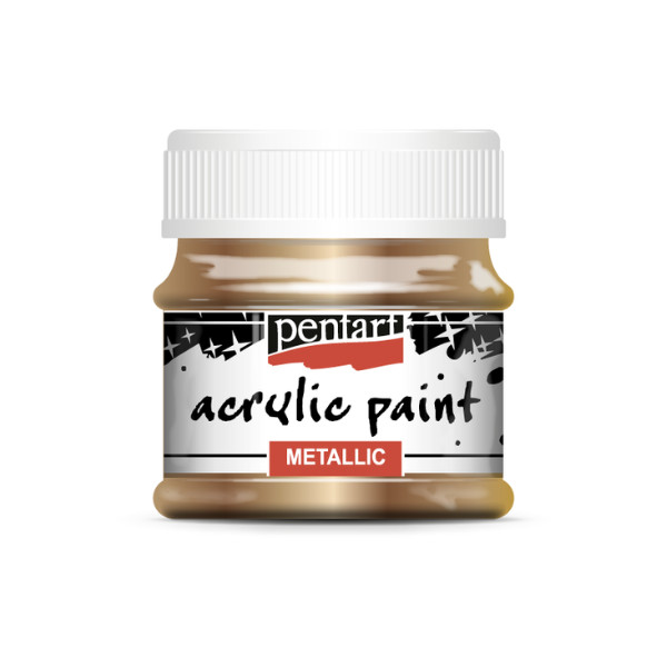 A Pentart metál akrilfesték kiváló fedést biztosít, gyorsan szárad és száradáskor vízálló. Vízbázisú, fémes hatású, vízzel hígítható akrilfesték. Kiválóan alkalmasak mindenféle felület festésére. Könnyen keverednek vízzel. Világos és nagyon intenzív színek széles választékát kínálja a művészeknek. Sok fémes pigmentet tartalmaznak, amelyek gyönyörű fényes felületet hoznak létre. Nemcsak dekorációs tárgyakhoz is alkalmasak, bátran ajánljuk a művészeknek is.