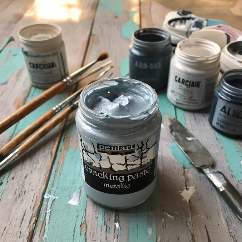 A felületet használat előtt érdemes portalanítani és alapozni, hogy a paszta jól tapadjon. A Pentart repedőpaszta metált egyenletes vagy szándékosan változó vastagságban vidd fel, attól függően, milyen repedésmintát szeretnél elérni. A száradás ideje függ a rétegvastagságtól és a környezeti körülményektől.