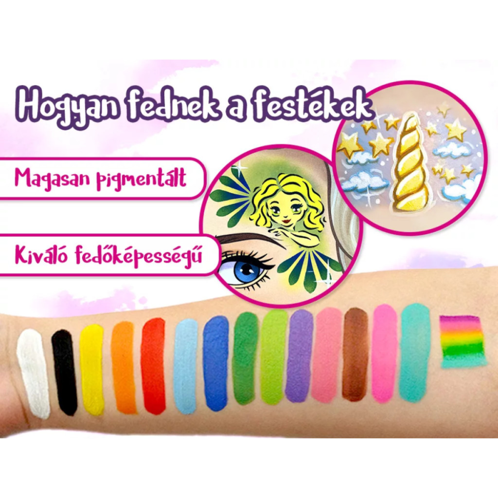Élénk, gyönyörű színek, magas pigmenttartalom. Vízzel könnyel eltávolítható, bőrbarát, allergénmentes.