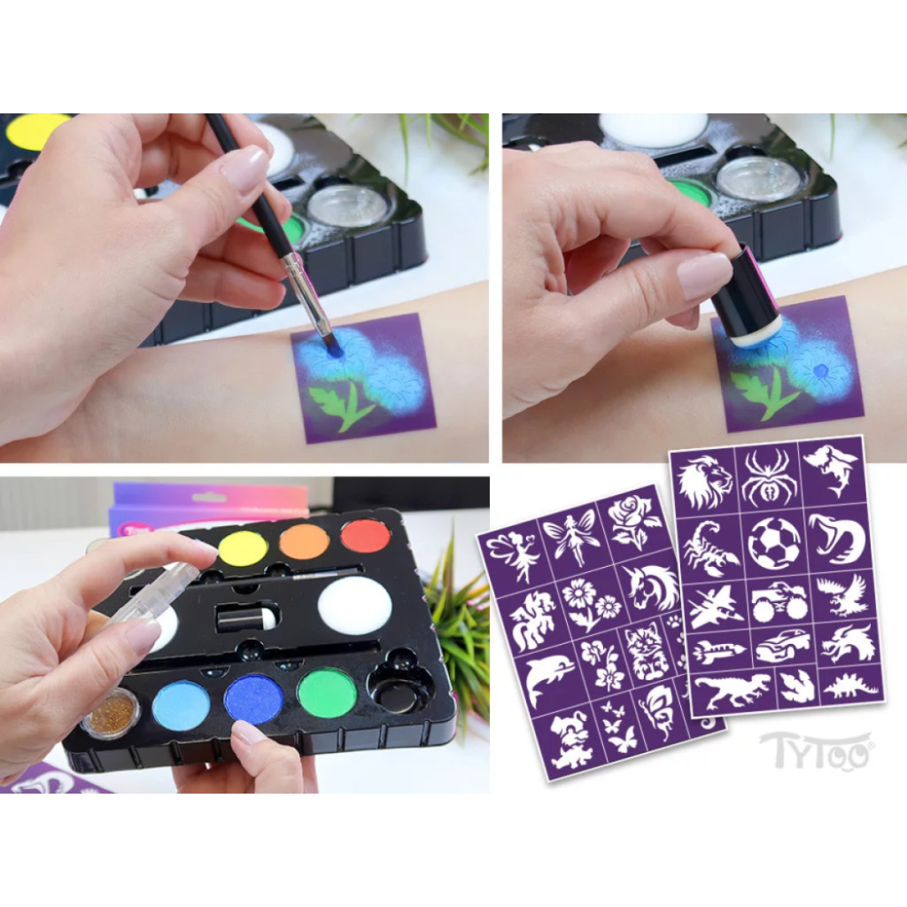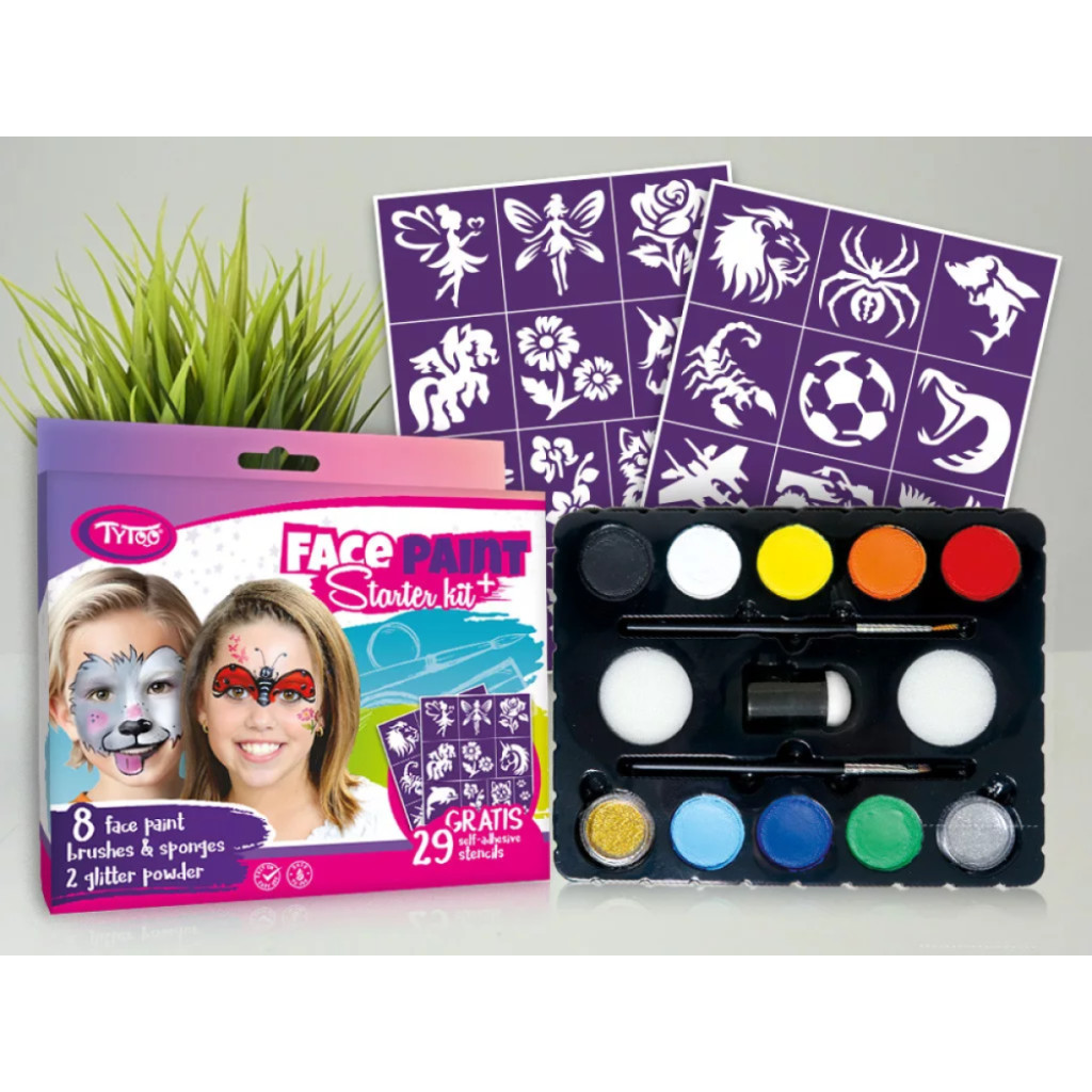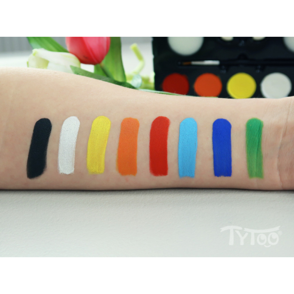 A nyolcszínű készletből ecset vagy szivacs segítségével egy mozdulattal tudsz sokszínű alapot festeni, vagy ecset segítégével akár aprólékos mintát. Az alap színekből további árnyalatokat is ki tudsz keverni, melyek a magas pigmenttartalomnak köszönhetően a színek élénkek és jól fedik a bőrt. Vízbázisú festékek, gyorsan száradnak és vízzel könnyen eltávolíthatók.