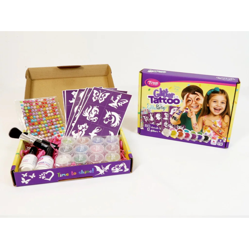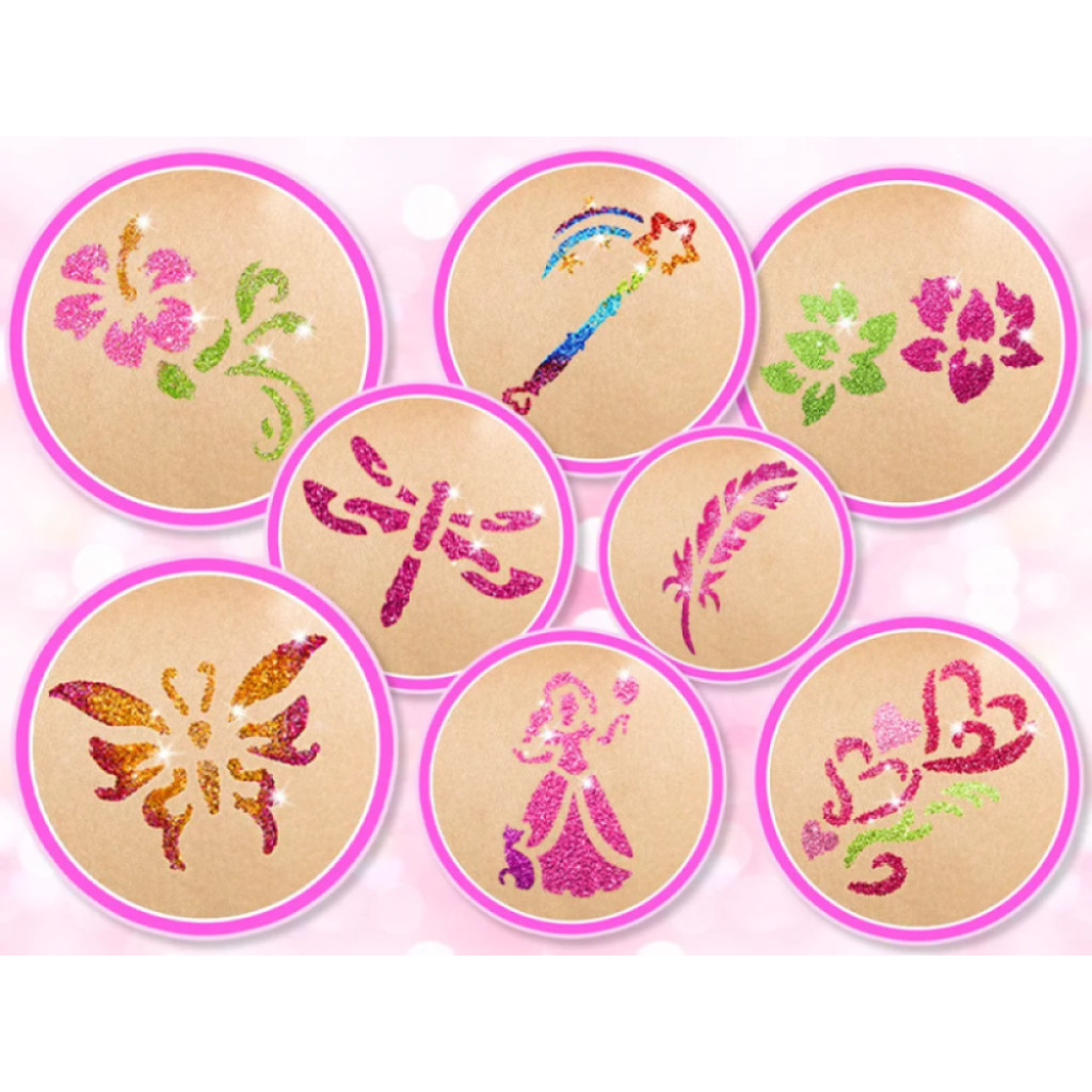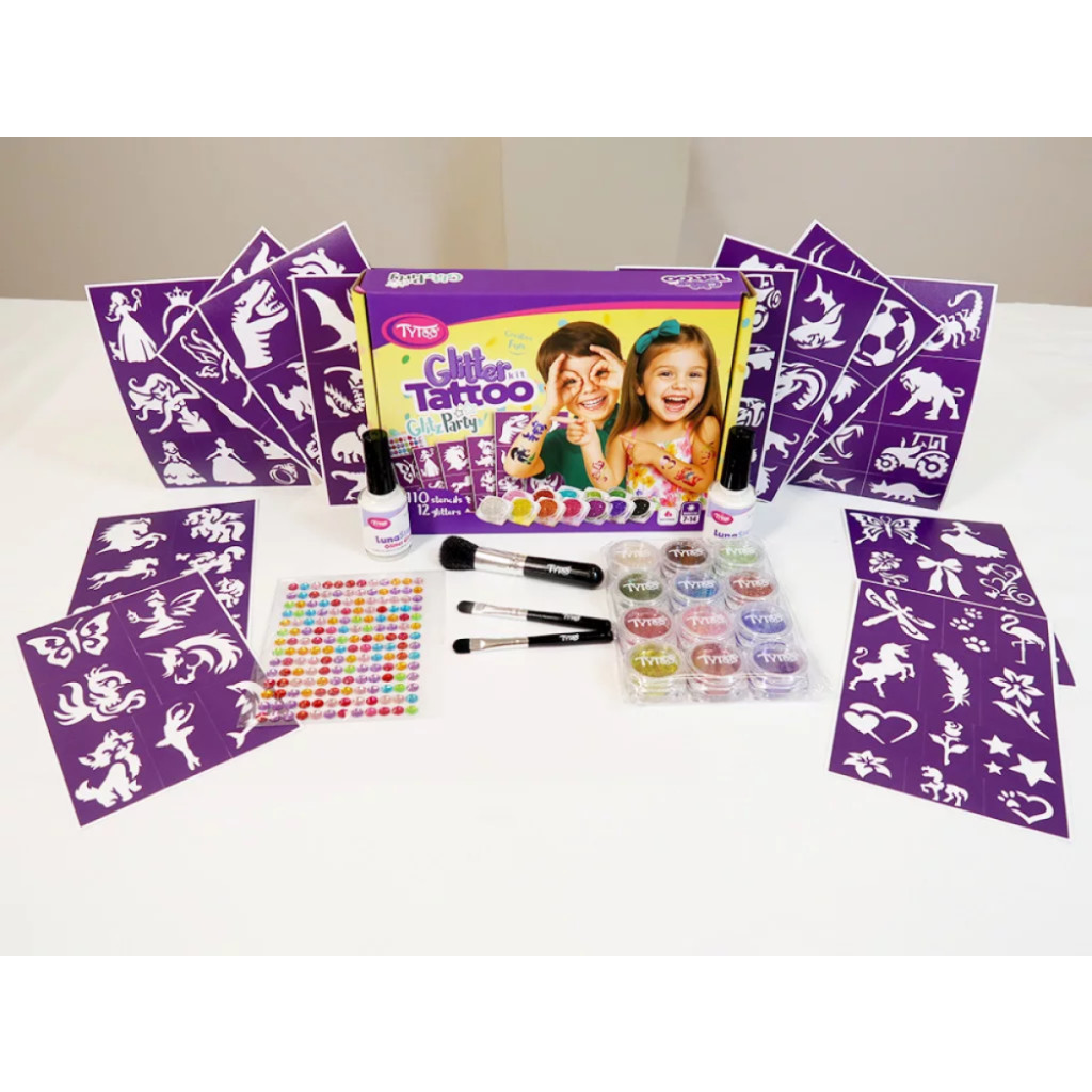 Komplett szett, amely minden hozzávalót tartalmaz csillámtetoválás készítéséhez.