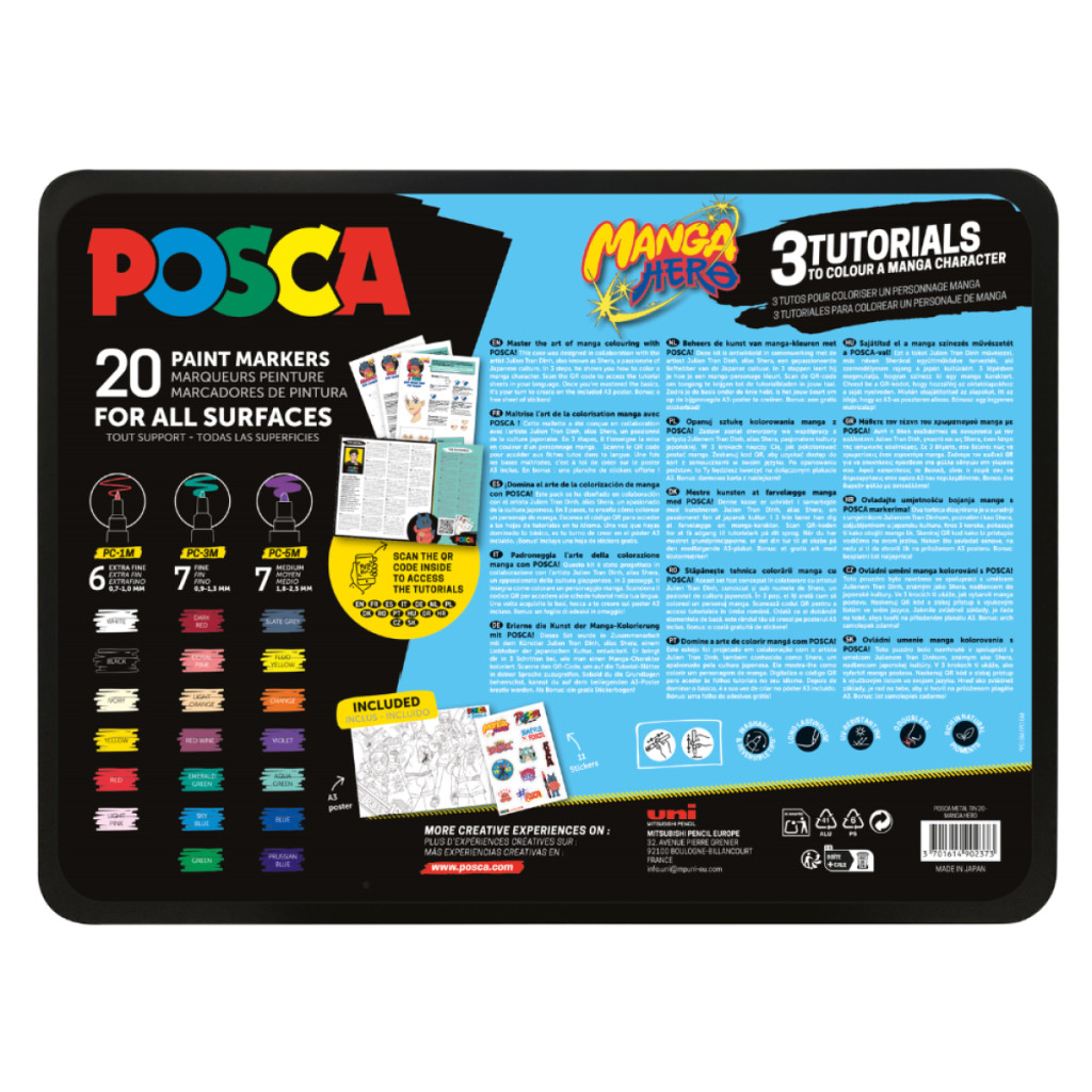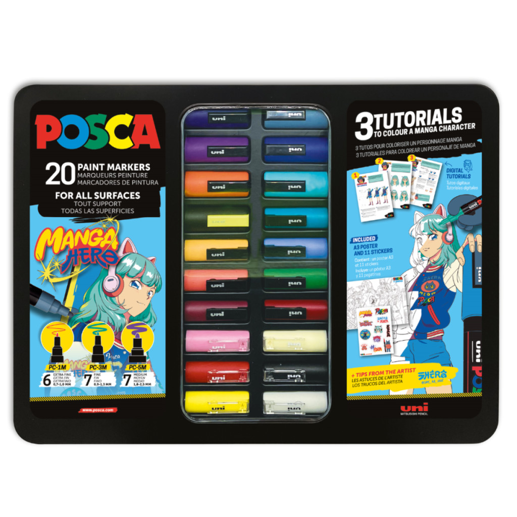 Az UNI POSCA vízbázisú festék markereit szabadon használhatod csaknem minden felületen: papír, fém, fa, bőr, cserép, gipsz, kő, textil, porcelán, műanyag, üveg. Nincs szükség alapozásra kitűnő fedőképességének köszönhetően. Színei száradás előtt vizes ecsettel összemoshatók, színei keverhetők. Ideális színezőkönyvekhez, mert nem üt át a papíron.