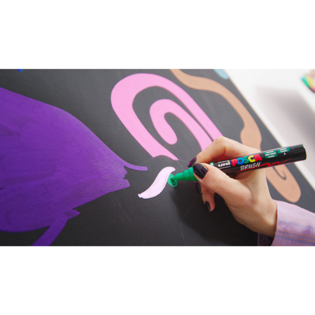Az UNI POSCA vízbázisú festék markereit szabadon használhatod csaknem minden felületen: papír, fém, fa, bőr, cserép, gipsz, kő, textil, porcelán, műanyag, üveg. Nincs szükség alapozásra kitűnő fedőképességének köszönhetően. Színei száradás előtt vizes ecsettel összemoshatók, színei keverhetők. Ideális színezőkönyvekhez, mert nem üt át a papíron.