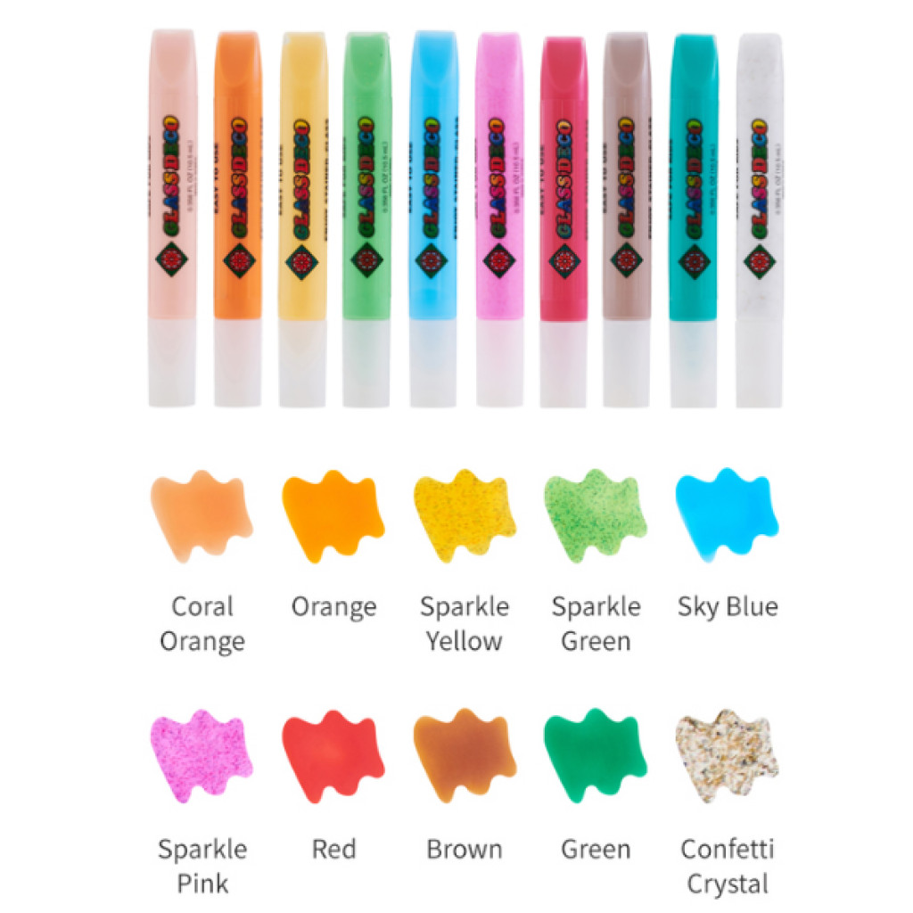 • 10 szín (korall, narancs, csillámos sárga, csillámos zöld, égkék, csillámos rózsaszín, piros, barna, zöld, átlátszó konfetti) - 10 x 10,5 ml